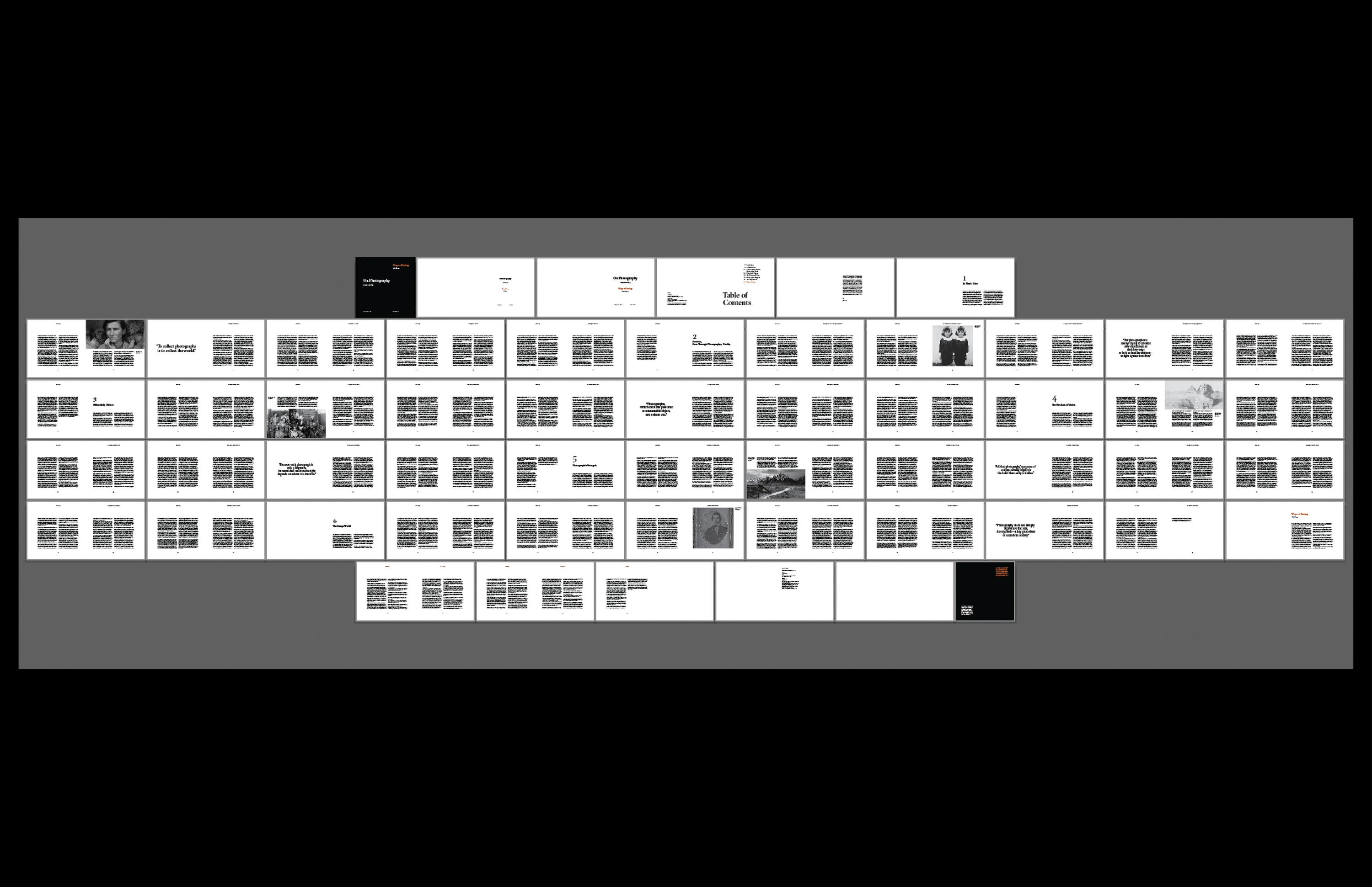 On Photography is a collection of essays published in 1977, and it is written by Susan Sontag, an American writer and political activist. To show different perspectives on the 1970s photography, I included two contents, On Photography by Susan Sontag and Ways of Seeing by John Berger, and designed the book.