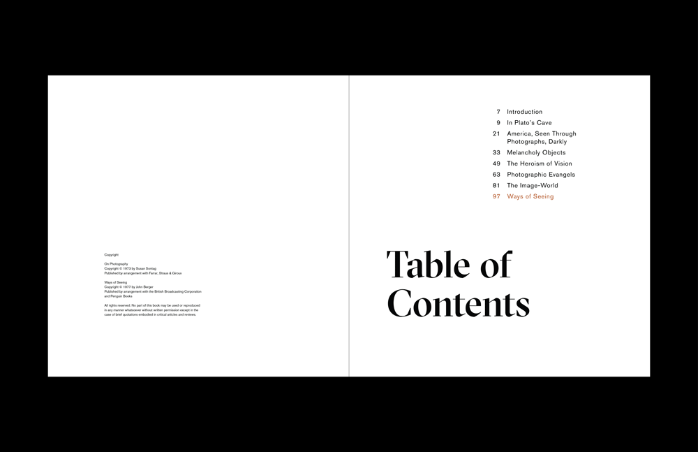 On Photography is a collection of essays published in 1977, and it is written by Susan Sontag, an American writer and political activist. To show different perspectives on the 1970s photography, I included two contents, On Photography by Susan Sontag and Ways of Seeing by John Berger, and designed the book.