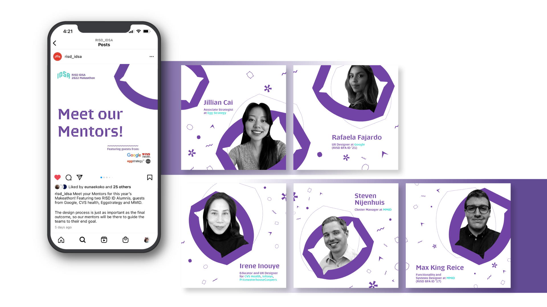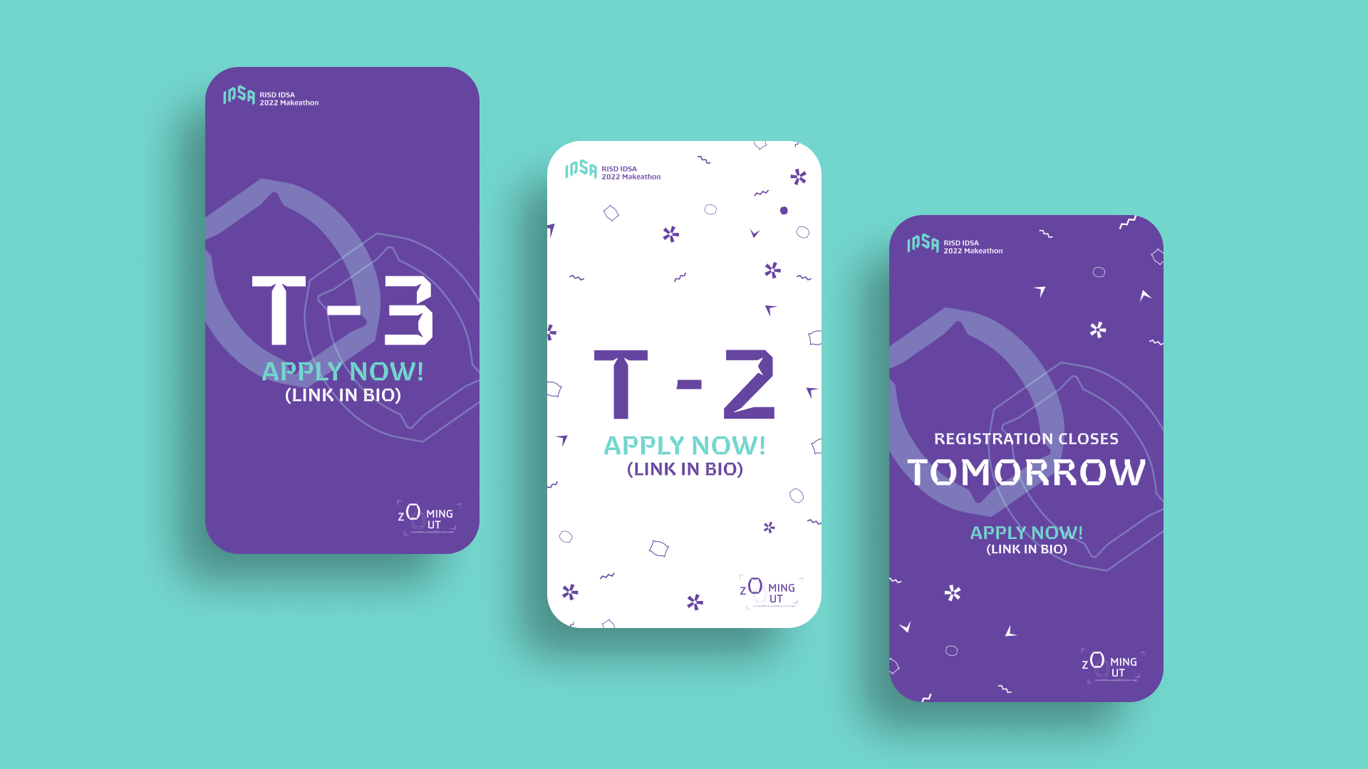 RISD Industrial Designers Society of America (IDSA) holds Makeathon, which is a creative design competition with visiting mentors from industry. The theme for 2022 was Zooming Out. As a junior designer, I created branding and marketing materials such as style guides, static and animated posters, social media posts, and merchandise.