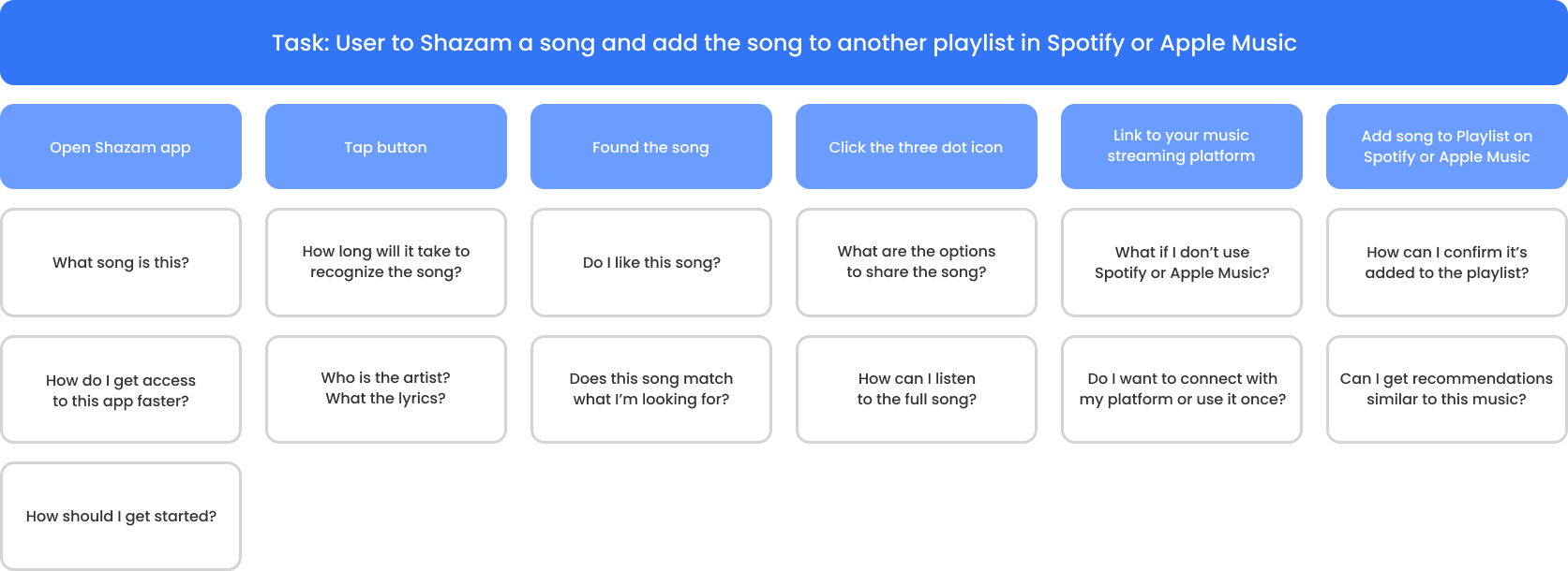 During the heuristic evaluation, we assessed the capabilities of the current Shazam app and prioritized the severity levels of the usability issues. One of the significant usability violations identified was that the current app is limited to a single playlist with no customization. Additionally, there are inefficient flows that are repetitive or require the user to take multiple steps to complete the task. This heuristic evaluation helped us to identify several issues with the current app that might cause users to be unsatisfied with the app.